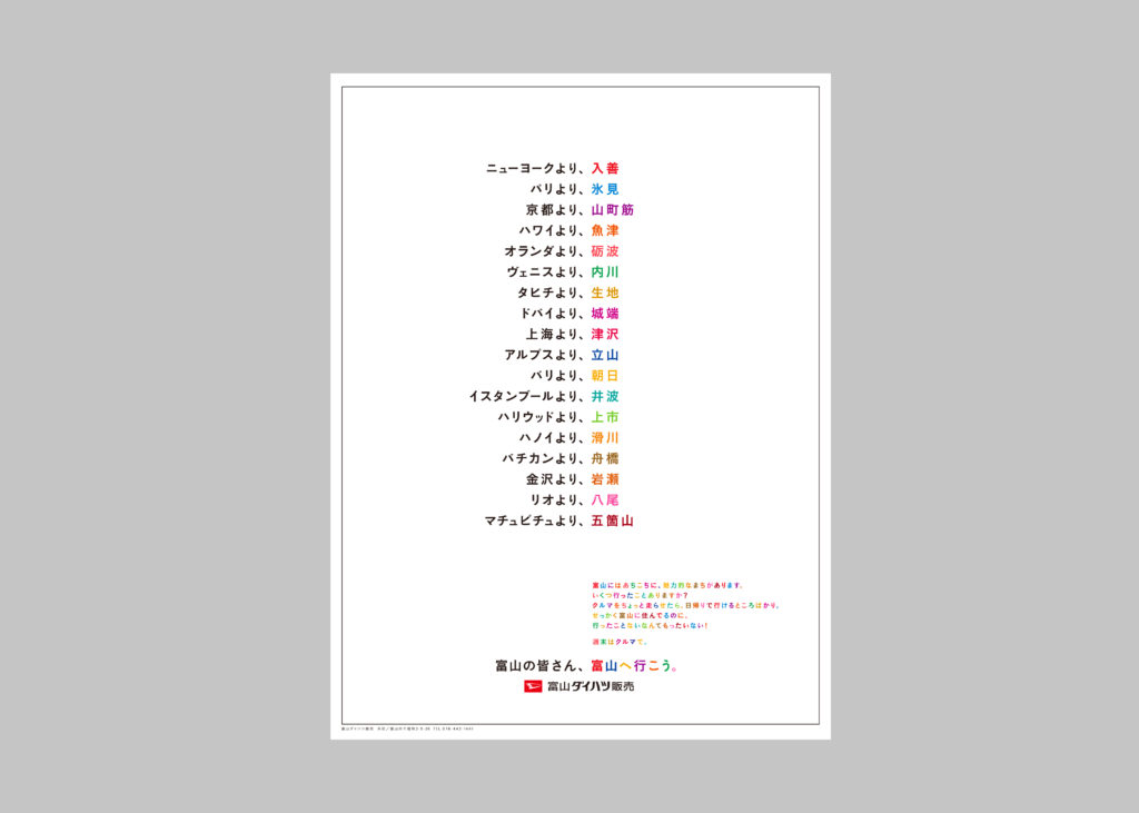 海外や都市圏などの外ではなく、地元や近所といった内に目をむけてもらおうとメッセージ。
