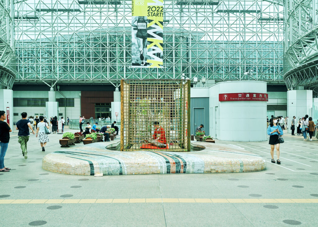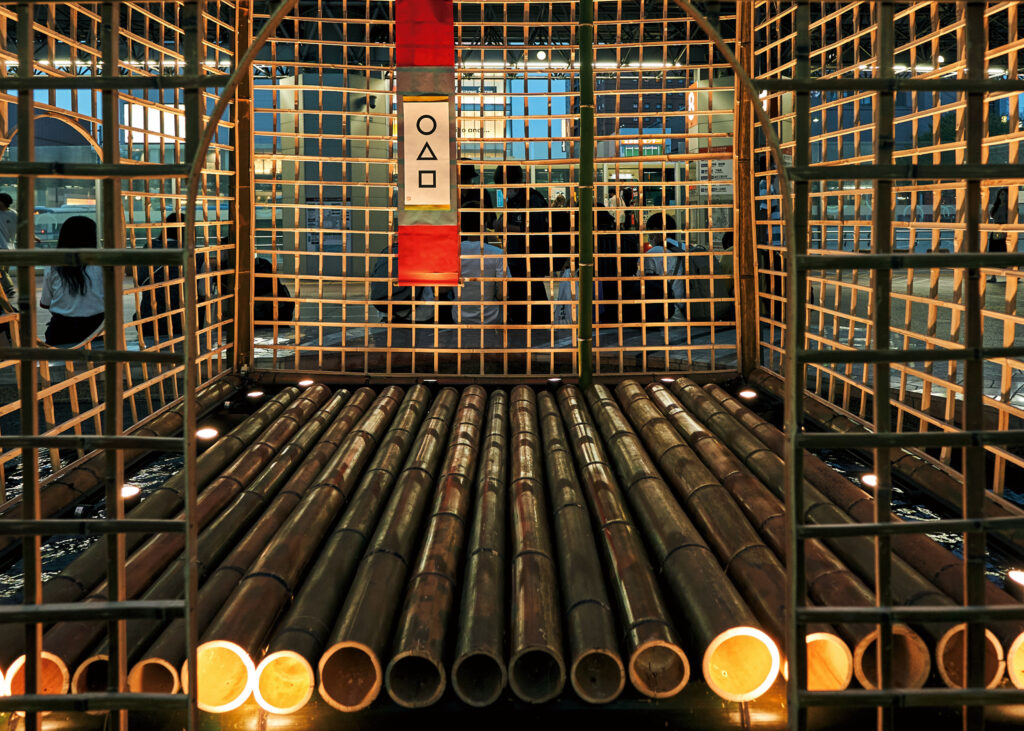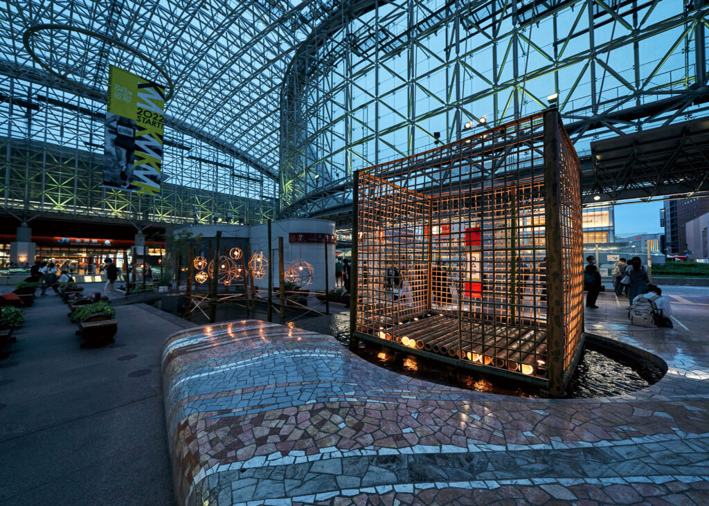 そこで世界でも美しいと評価されている金沢の玄関口で、おもてなしの茶の湯の精神を竹の野点茶室「観月庵」として表現。竹は山から切り出したものを使い、数時間でいっきに組み上げるという時間との戦いでもあったが、昼には琴の演奏が、夜には水に浮かぶ茶室が金沢を訪れた人を愉しませた。